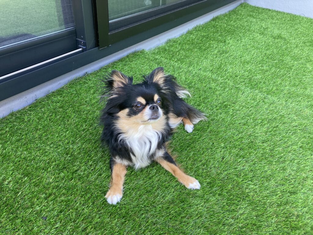 麦央は早速人工芝を敷いたバルコニーで遊んでいます。